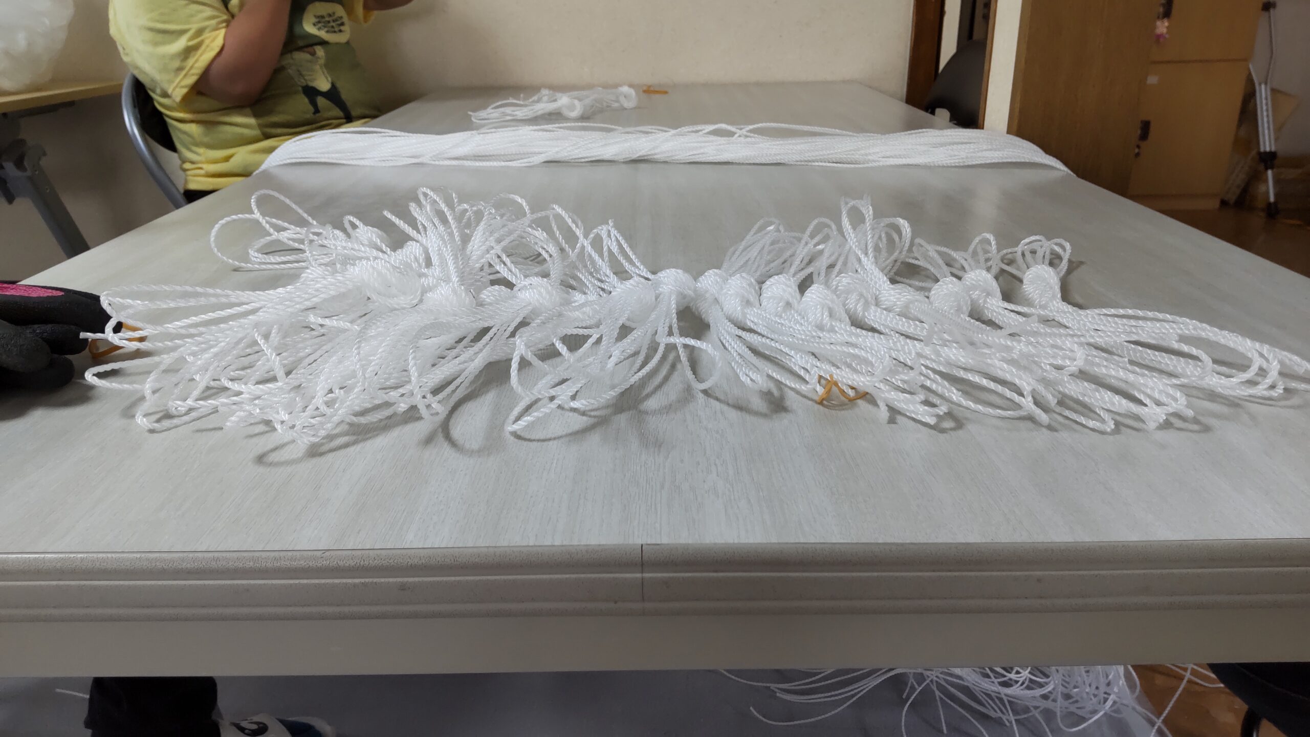 今日は、ひも結びの内職に取り組んでいます🪢先週は1メートルの紐で、今日は3メートルの紐です✨それぞれ結び方は違うのですが、慣れてくれば誰でも簡単にできるような内職です😄