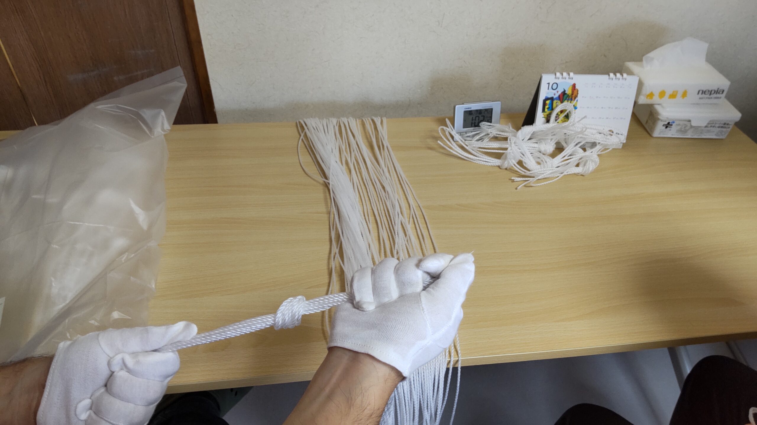 今日のサポートワンでは、久しぶりに紐縛りの内職作業をしています🪢2種類の紐があるのですが、写真の紐は3回折り曲げて団子結びにするだけの簡単な作業になります😊サポートワンでは、いろいろな内職に取り組んでいるので、利用者みんな飽きずに楽しく作業に取り組めていると思います🤗