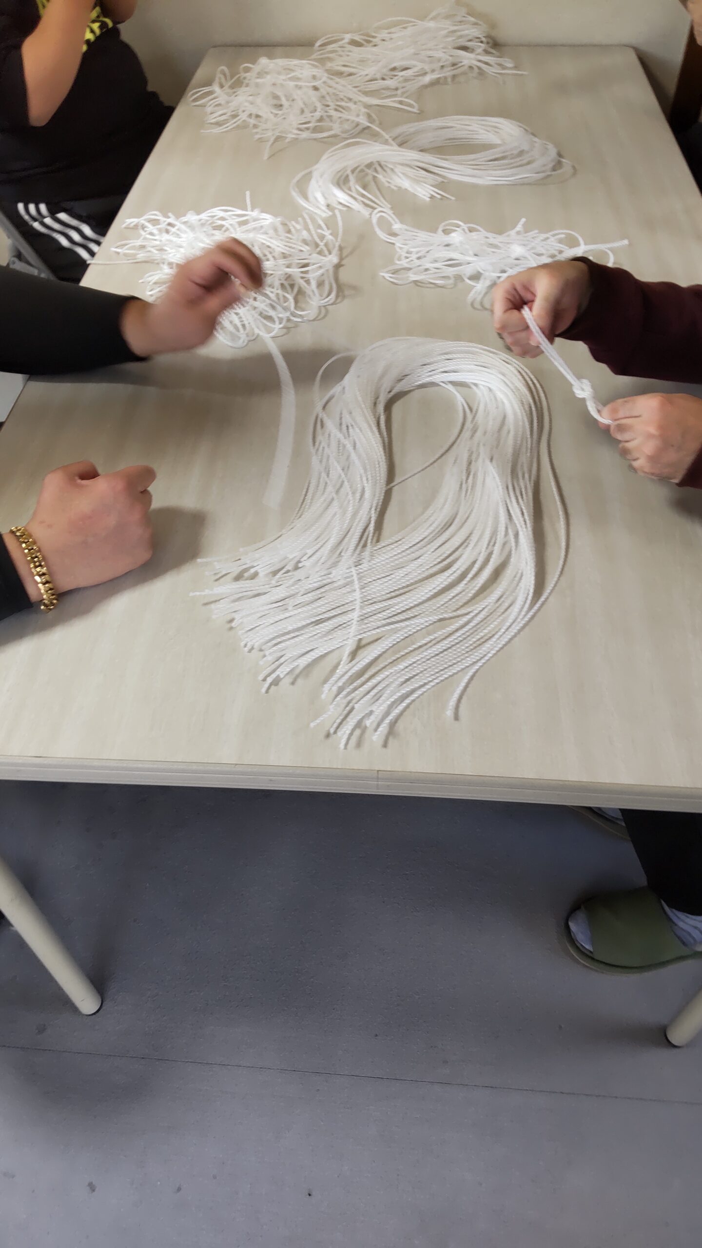 最近は複数の内職を分担して作業している事が多かったですが、今日はみんなで紐縛りの内職作業をしています🪢先週は団子結びにするだけの紐でしたが、今日は引き解け結びという少し変わった結び方をする内職作業をしています💪